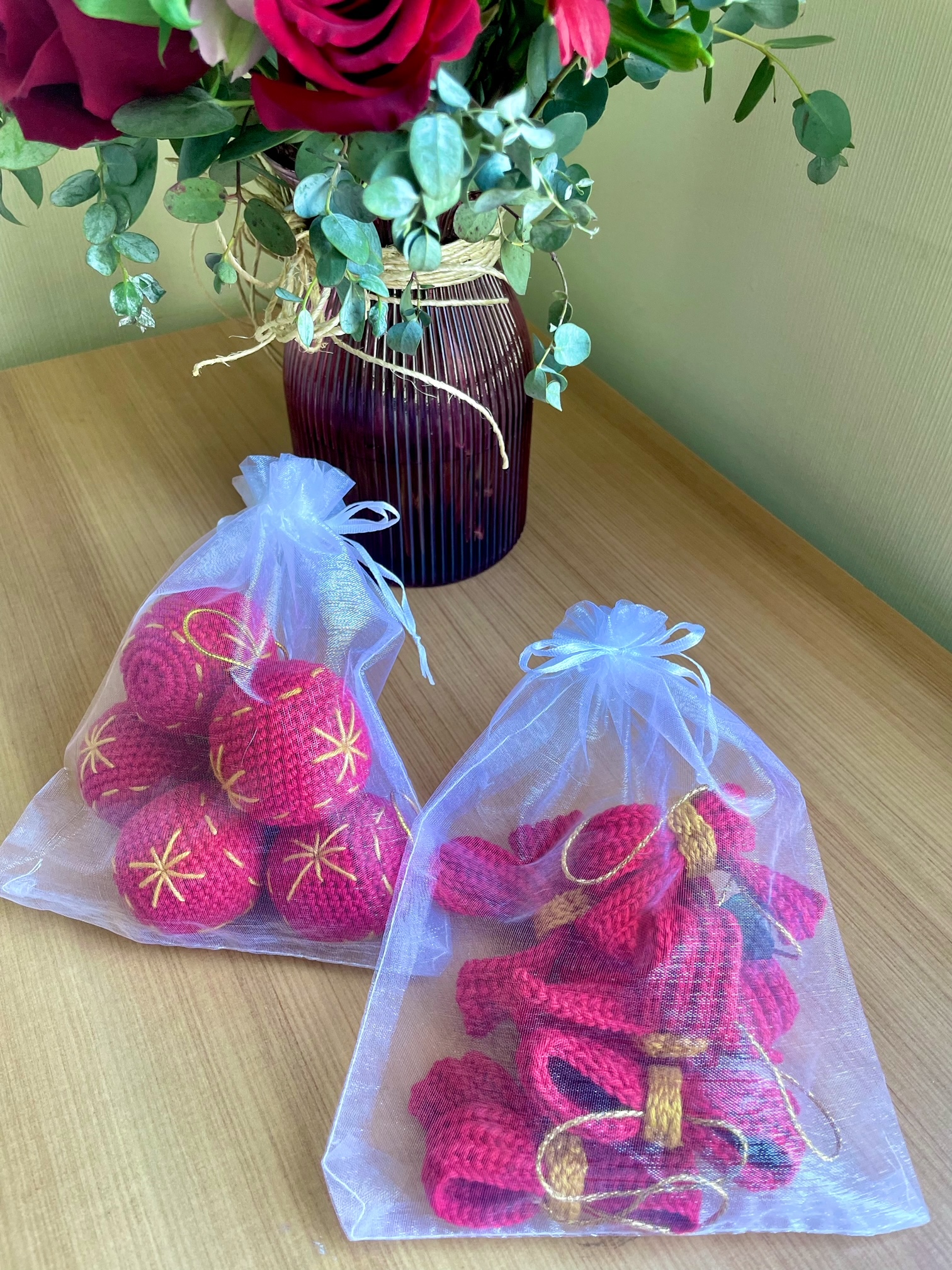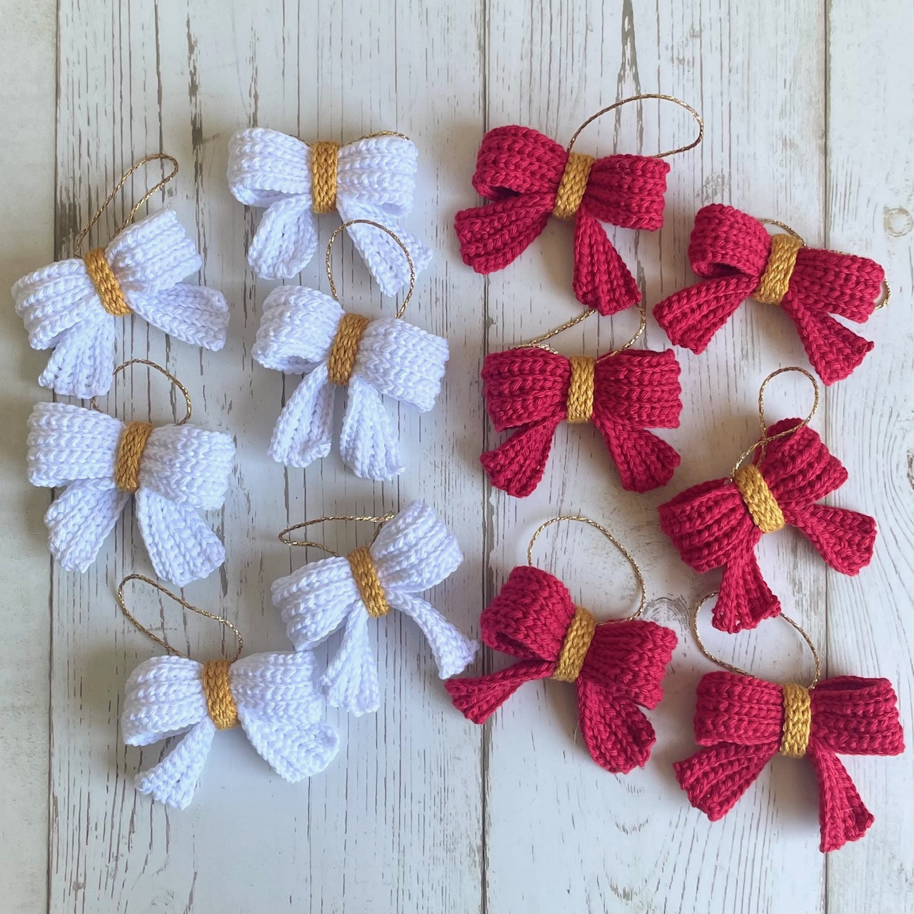 Un árbol navideño decorado con adornos hecho a mano lo hará único. Cada set es de 12 pelotitas o lazos, en rojo o blanco que puedes combinar como quieras. Hay 10 opciones distintas de combinaciones y están tejidos en 100% algodón.
